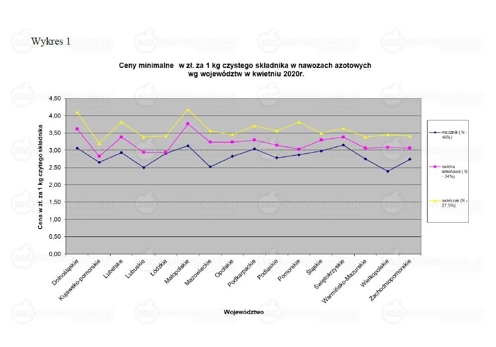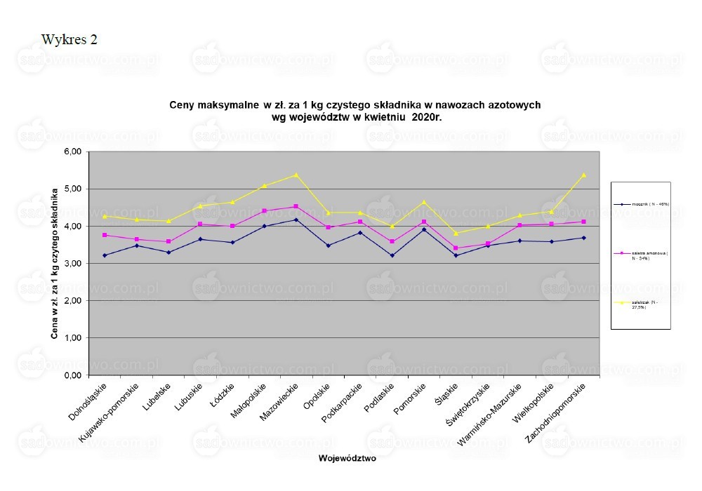 Wśród rozpatrywanych przez nas cen nawozów azotowych za kwiecień 2020r. dla cen maksymalnych, cena czystego składnika – azotu jest najniższa w moczniku, na drugim miejscu – w saletrze amonowej a najdrożej czysty składnik nadal kosztuje w saletrzaku. Prawidłowość ta dotyczy większości województw (Wykres 2). Dla cen minimalnych czystego składnika utrzymuje się podobna tendencja cena azotu najniższa jest w moczniku a najwyższa w saletrzaku (Wykres 1).