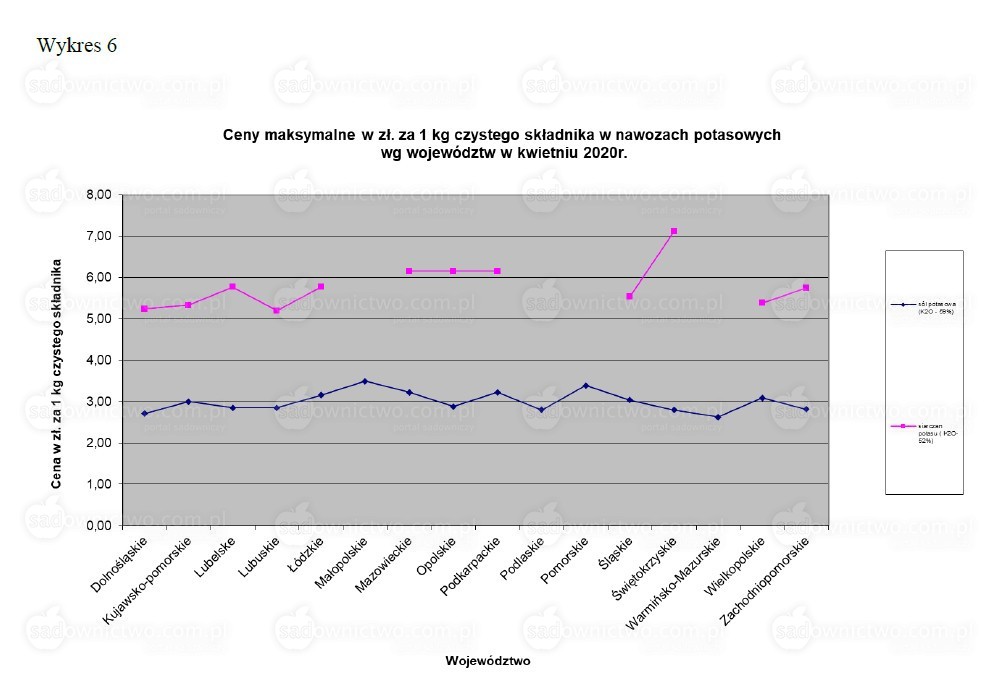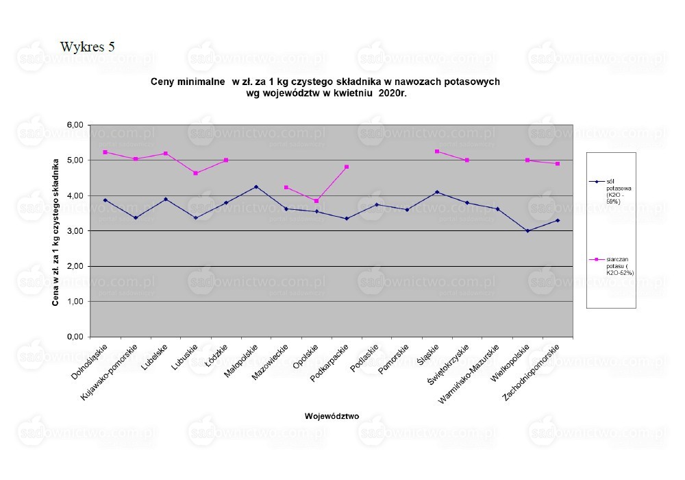 Dla nawozów potasowych nie posiadamy wszystkich danych, gdyż w wielu województwach punkty skupu nie prowadzą sprzedaży siarczanu potasu. Z analizy posiadanych informacji wynika, że zarówno dla cen minimalnych jak i maksymalnych czysty składnik – potas, jest zdecydowanie tańszy w soli potasowej niż w siarczanie potasu, prawidłowość ta dotyczy większości województw (Wykresy 5,6).