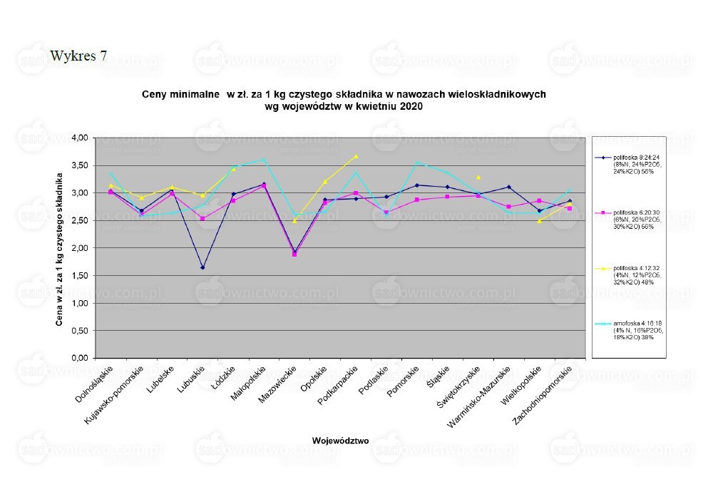 Dla nawozów wieloskładnikowych jako czysty składnik potraktowano azot, potas oraz fosfor łącznie. Ceny czystego składnika w nawozach wieloskładnikowych przyjętych do analizy – polifosek oraz amofoski nie wykazują jednoznacznych prawidłowości. (Wykresy 7,8).