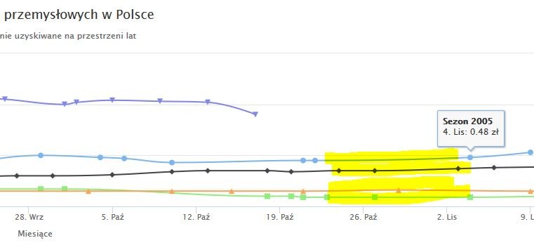 Popatrz na mój mały wykres, przed 1 listopada i zarza po nim cena na podobnym poziomie, ale później idzie w górę. W tym roku zakłady mocno się przeliczyły teraz pozostaje im dawać lepszą cenę aby ci co mają towar schowany chieli go oddać na soki bo tego pod drzewami już nie ma więc ja jak mam im wysypać za 30 groszy wysypię i w lutym mi się nie śpieszy.