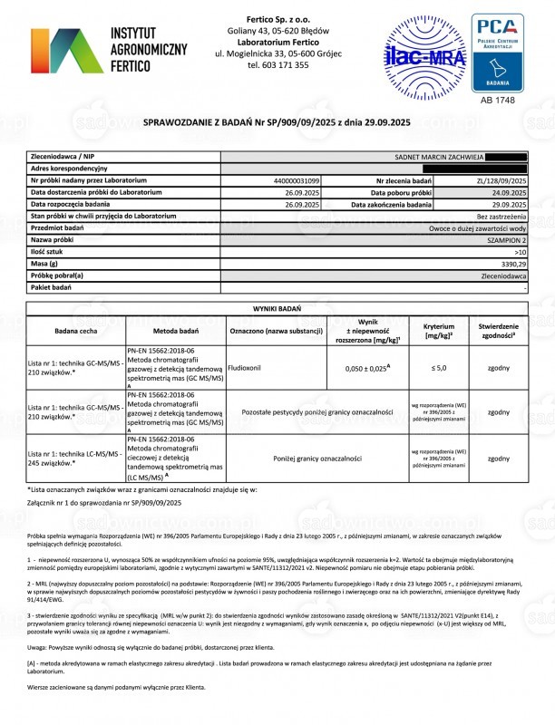 Dziś jednak chciałbym przedstawić swoje wyniki analiz jabłek np.: odmiany Szampion i pokazać, że produkcja owoców bez pozostałości nie jest czymś szczególnie trudnym i wymagającym. Kilka innych rozwiązań w zwalczaniu chorób i szkodników, kilka więcej przejazdów opryskiwaczem w sadzie i mamy czysty sad przez cały sezon i czyste jabłko podczas zbiorów.