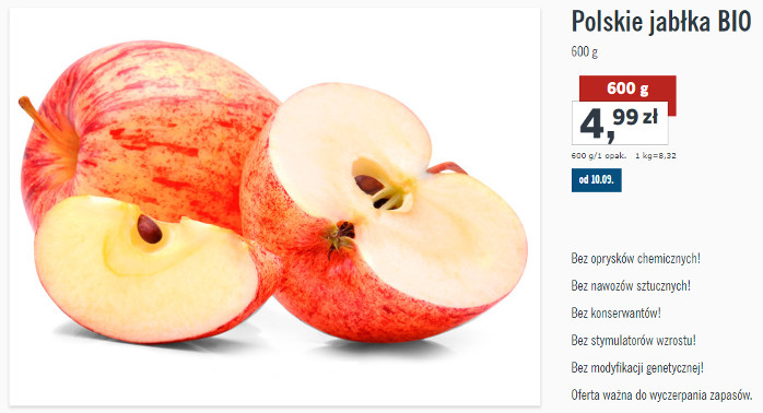 Jak czytamy na stronie Lidla od 10 września w sklepach Lildla możemy znaleźć m.in. polskie jabłka BIO po 4,99 zł/kg: