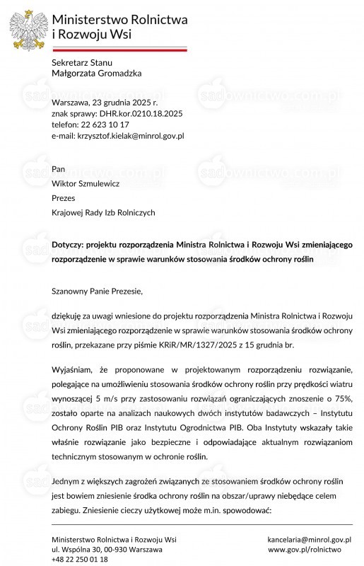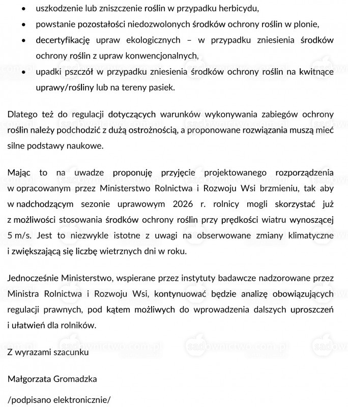 (...) proponowane w projektowanym rozporządzeniu rozwiązania polegające na umożliwieniu stosowania środków ochrony roślin przy prędkości wiatru wynoszącej 5 m/s przy zastosowaniu rozwiązań ograniczających znoszenie o 75% zostało oparte na analizach naukowych dwóch instytutów badawczych - Instytut Ochron Roślin PIB oraz Instytut Ogrodnictwa PIB.