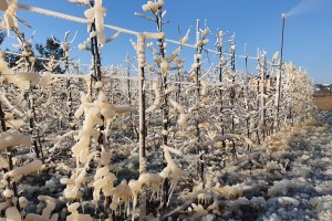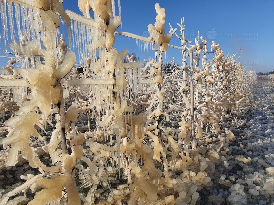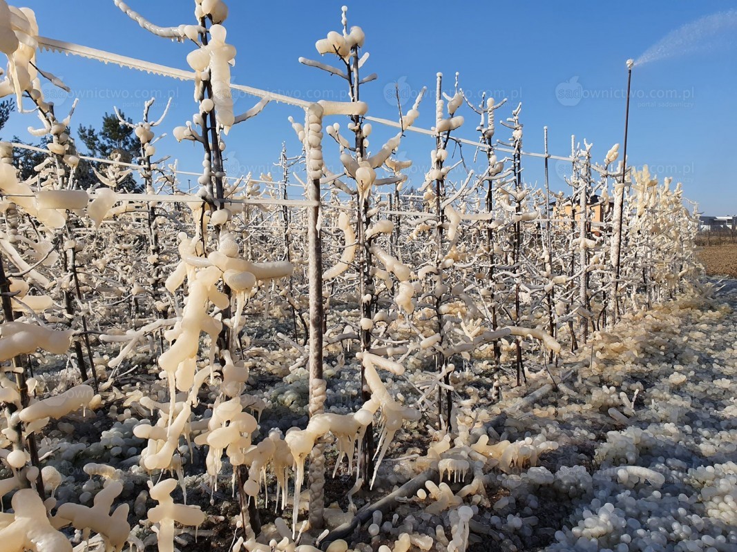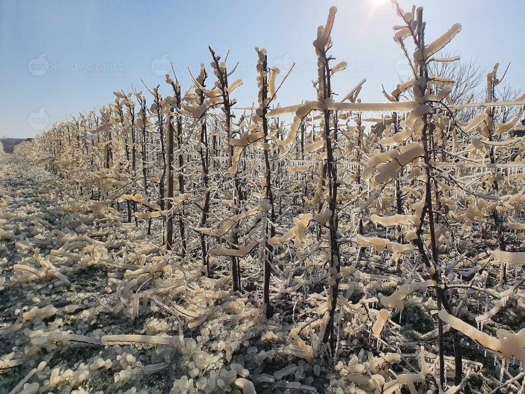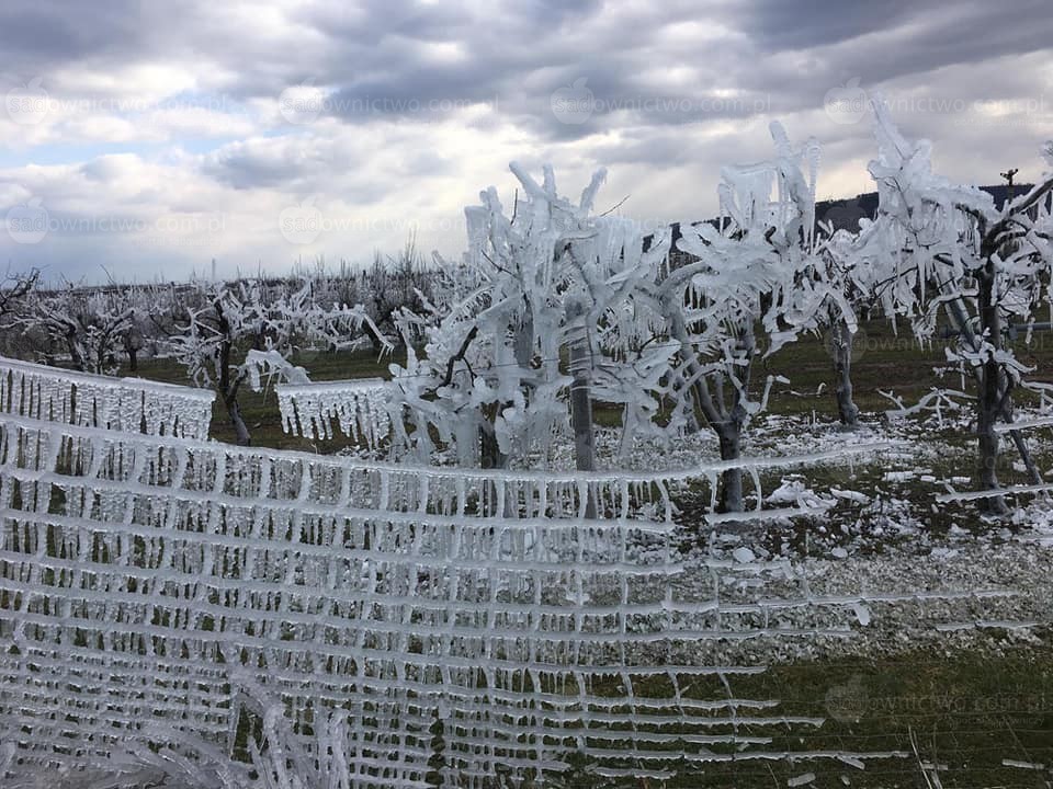 Oszczędzajmy siły, sprawne instalacje i wodę, na sytuacje, kiedy faktycznie będzie to uzasadnione. W tej fazie, w jakiej zatrzymały się jabłonie i grusze, brak uszkodzeń, nawet po -10. Tymczasem, przy obecnym klimacie, uruchamiając zraszanie, można wyrządzić sadom i sobie więcej szkody, niż dobrego. Przy obecnej bardzo niskiej wilgotności, mamy specyficzną sytuację, bo punkt rosy w poprzednie 2 noce, wynosił nawet -14 stopni (dane ze stacji iMetos). Wskutek tego odczuwalna temperatura jest dużo niższa, powstaje bardzo dużo lodu a zraszacze zamarzają. Dodatkowo w ciągu dnia jest max 3-5 stopni na plusie, ale zimny wiatr powoduje, że lód nie rozmarza. Bardzo niebezpieczna sytuacja....