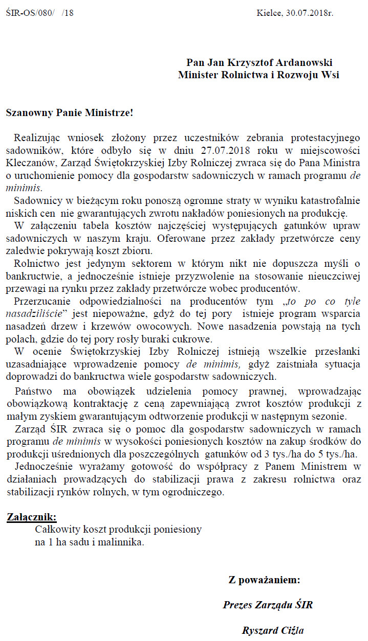 Realizując wniosek złożony przez uczestników zebrania protestacyjnego sadowników, które odbyło się w dniu 27.07.2018 roku w miejscowości Kleczanów, Zarząd Świętokrzyskiej Izby Rolniczej zwraca się do Pana Ministra o uruchomienie pomocy dla gospodarstw sadowniczych w ramach programu de minimis.