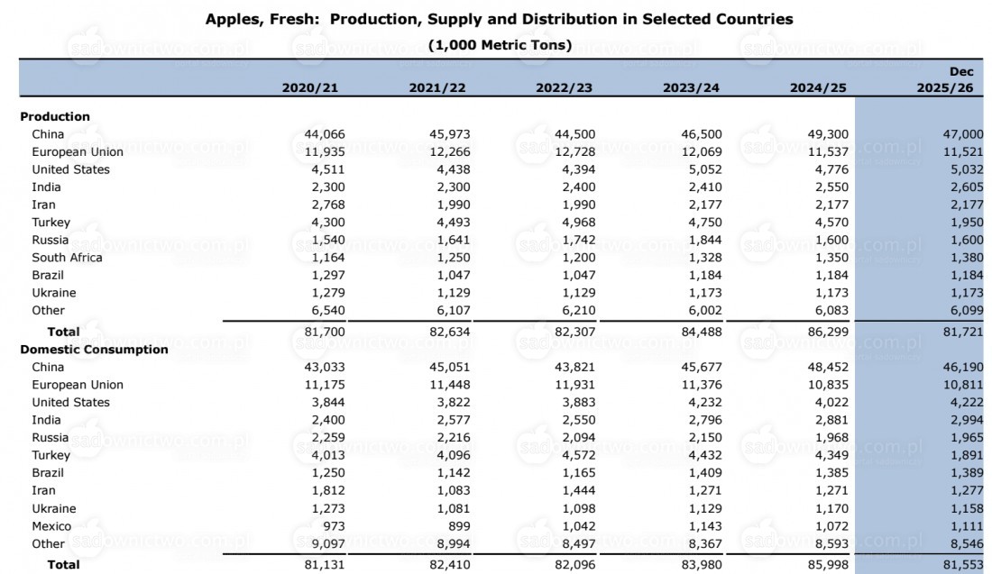 Jak informuje USDA światowa produkcja jabłek w 2025 roku wyniosła około 82 mln ton.