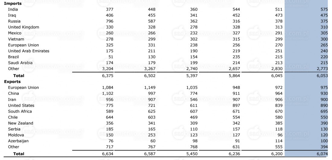 Największym importerem jabłek w sezonie 2025/2026 będą Indie, który zaimportują ok. 575 tys. ton jabłek. Do Iraku trafi 475 tys. ton jabłek, a do Rosji 375 tys. ton jabłek.