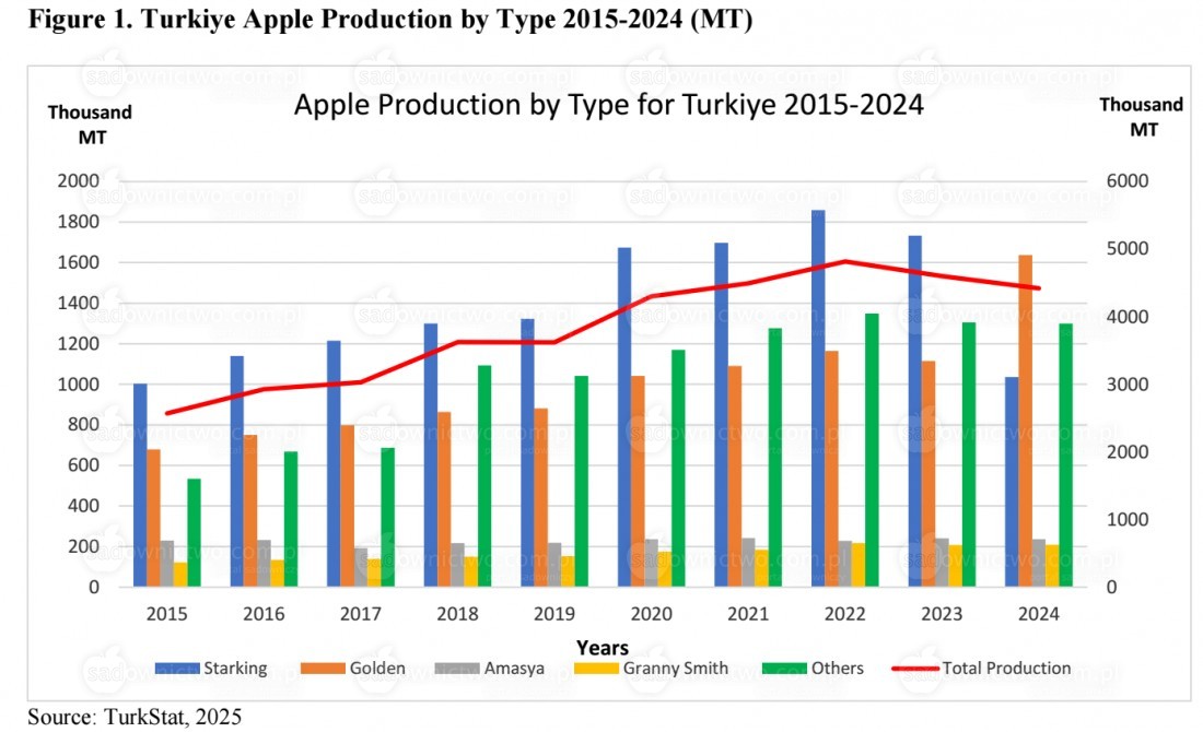 Jak wynika z danych udostępnionych przez USDA (United States Departament of Agriculture) zbiory jabłek w Turcji w 2025 roku wyniosą około 1,8 mln ton, czyli aż o 60% mniej w porównaniu do poprzedniego sezonu kiedy zebrano 4,4 mln ton jabłek.