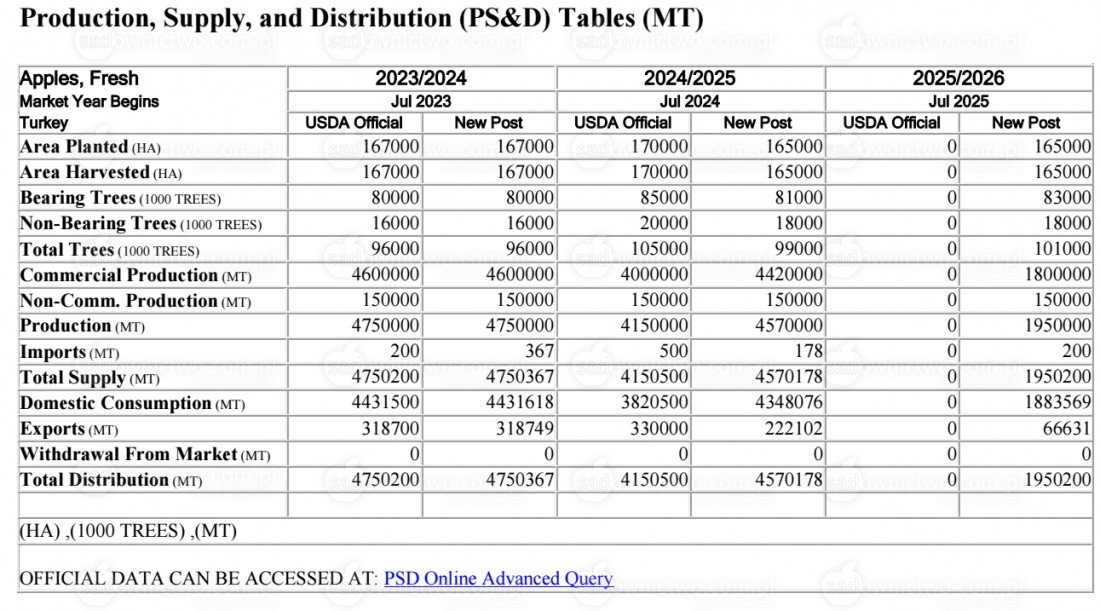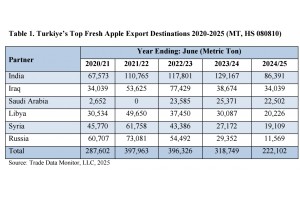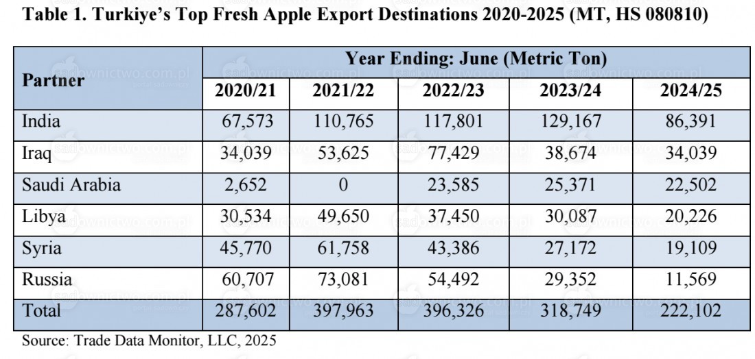 USDA szacuje, że Turcja wyeksportuje w tym sezonie (2025/2026) jedynie 66 tys. ton jabłek, czyli aż o 70% mniej niż w poprzednim sezonie. W sezonie 2024/2025 najwięcej tureckich jabłek trafiło do takich krajów jak Indie, Irak, Arabia Saudyjska, Libia, Syria i Rosja.