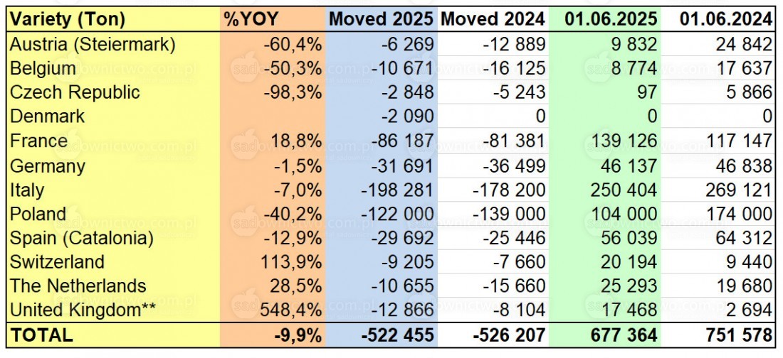 Jak wynika z raportu udostępnionego przez The World Apple and Pear Association (WAPA) zapasy jabłek w Unii Europejskiej na dzień 1 czerwca 2025 roku wynosiły niecałe 677 tys. ton, w czerwcu 2024 roku było to prawie 751 tys. ton.