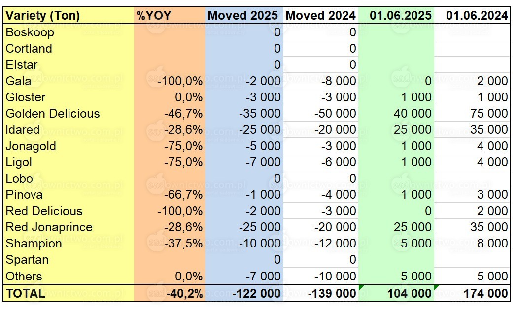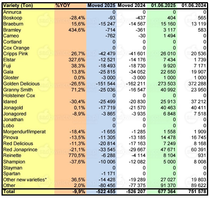 W polskich magazynach na dzień 1 czerwca 2025 roku najwięcej znajdowało się jabłek odmiany Golden Delicious (40 tys. ton), Idared i Red Jonaprince (25 tys. ton). W ciągu miesiąca od 1 maja do 1 czerwca 2025 r. w polskich chłodniach najwięcej ubyło takich odmian jabłek jak Golden Delicious (-35 tys. ton), Red Jonaprince i Idared (-25 tys. ton) oraz Szampion (-10 tys. ton),